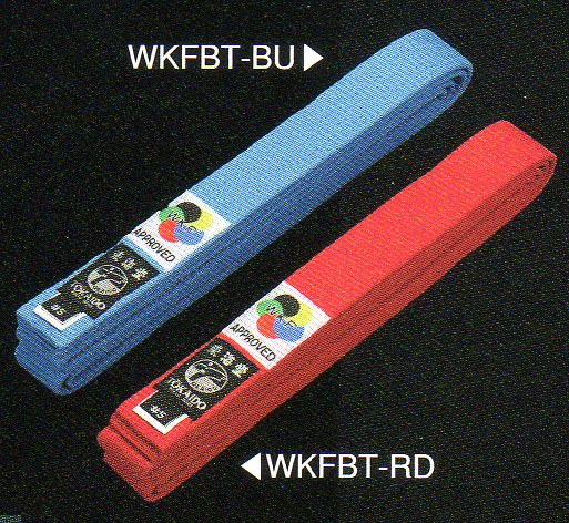 Normal quality colour red and blue WKF approved belts for use in competition. WKF label above Special Tokaido label.